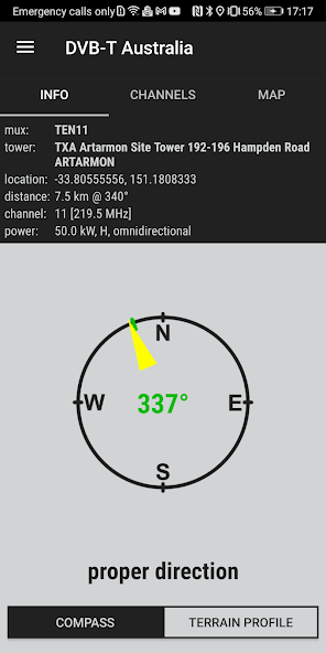 เครื่องมือนี้จะช่วยให้คุณค้นหาช่อง DVB-T ที่ใกล้ที่สุด ใช้ GPS และอินเทอร์เน็ต Finder DVB-T แสดงหมายเลขช่องความถี่, พลังงาน, โพลาไรเซชันของสัญญาณ, azimuth, รายการช่อง, แผนภูมิระดับความสูง (ทำงานช้า) และแสดงแผนที่