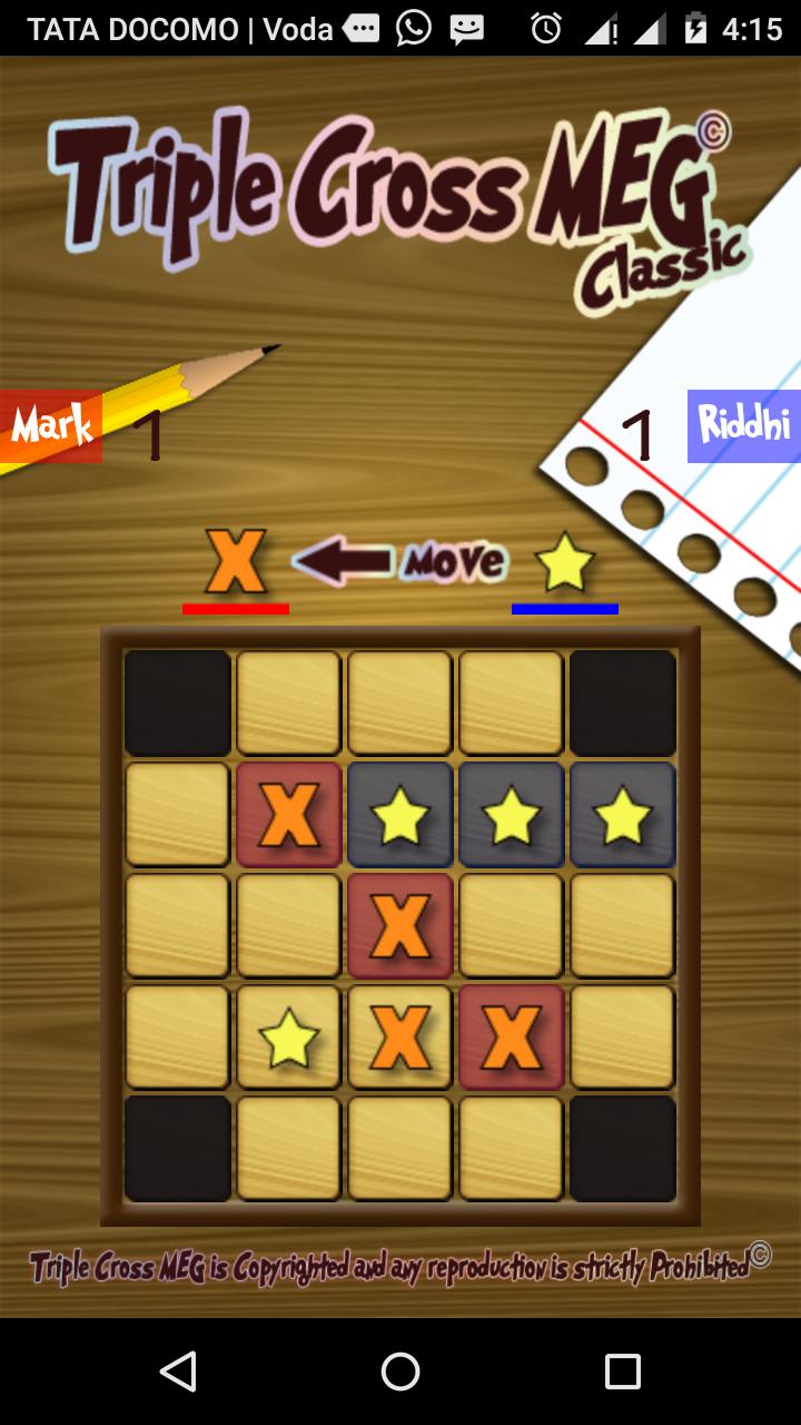 การผสมผสานกลยุทธ์ของหมากรุกการเล่นที่ผ่อนคลายและความรู้สึกออกไปจาก tic-tac-toe แง่มุมทางสังคมของ Connect 4, (Triple Cross Meg) เป็นส่วนเสริมที่น่าตื่นเต้นในตลาดเกมกระดานที่นิ่ง ผลิตผลของนักออกแบบเกมจากแมนเชสเตอร์ M.Roberts, Triple Cross Meg ที่วางจำหน่ายในร้านค้า Google Play และเป็นเกมที่ฉลาดทั้งสี่เกม