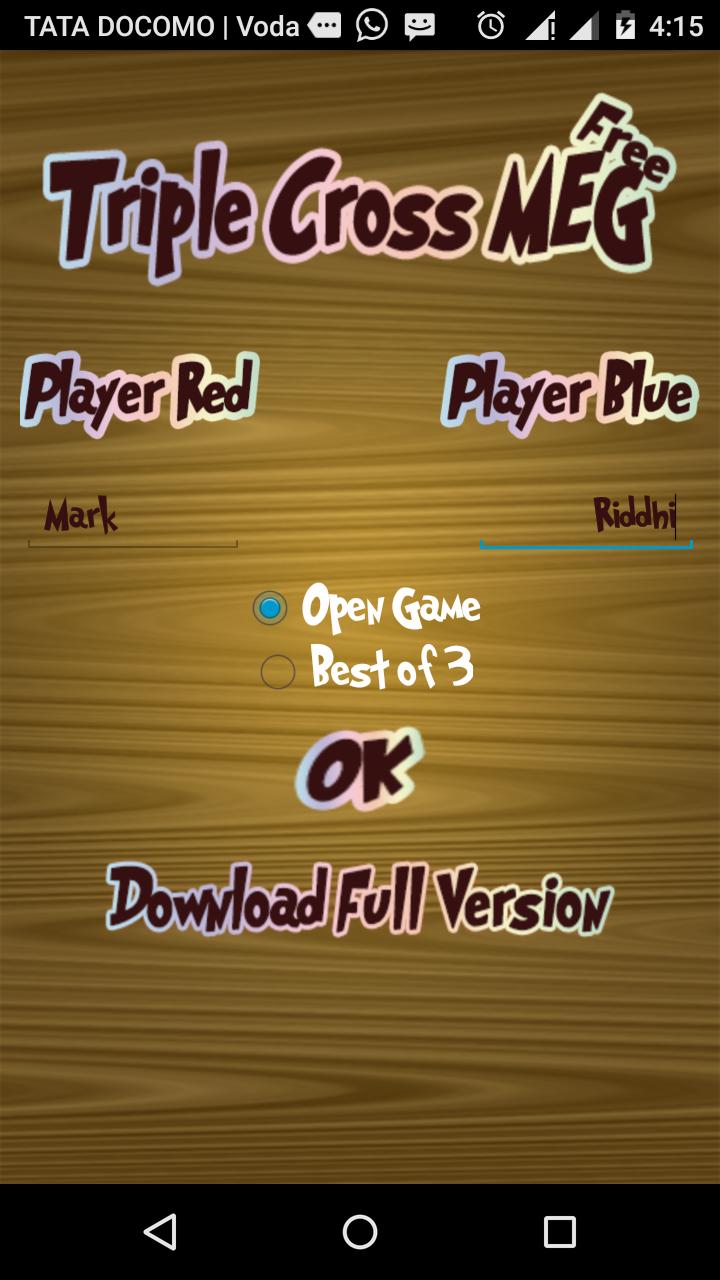 Triple Cross Meg เวอร์ชันฟรีมีโหมดเปิดเกมที่คุณสามารถเล่นเพื่อนของคุณในพื้นที่และยังมีโหมดทัวร์นาเมนต์ที่เป็นเกมที่ดีที่สุดในสามเกม ในเกมดาวน์โหลดเต็มรูปแบบของเกม The Tournament Stage นั้นดีที่สุดจาก 3 เกม 5 เกมและ 13 เกม