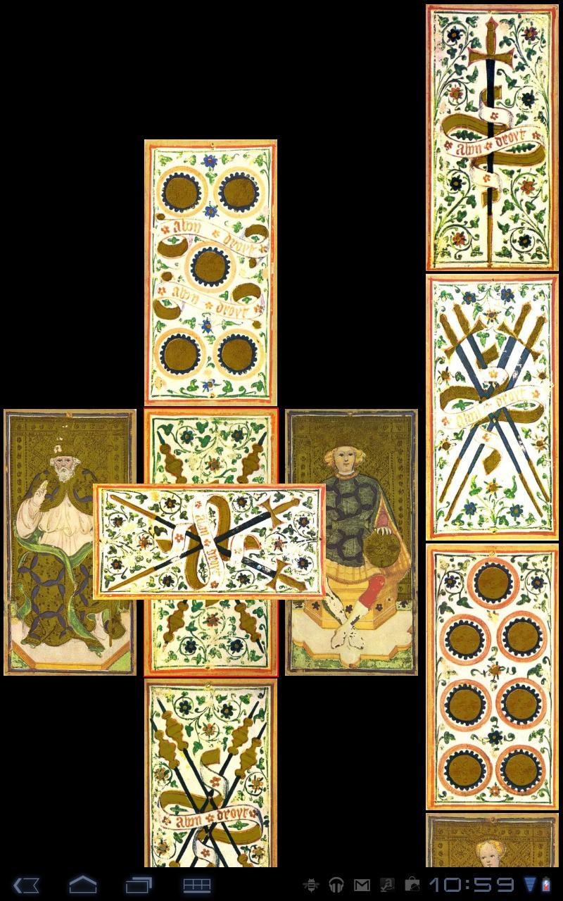 อินเทอร์เฟซซึ่งนำเสนอไพ่ทาโรต์ได้รับการออกแบบโดยมีเป้าหมายหลักในการดึงออกมาจากสิ่งประดิษฐ์ทางกายภาพ (เด็คการ์ด) คุณลักษณะเหล่านั้นซึ่งมีความหมายต่อการอ่าน: ภาพการตีความและบริบท การสับเปลี่ยนแบบดั้งเดิมการซื้อขายและการจัดเรียงการ์ดจะถูกลบออกจากกระบวนการที่ช่วยให้ประสบการณ์การอ่านที่มีความคล่องตัวยิ่งขึ้นเกิดขึ้น ประสบการณ์อาจขาดองค์ประกอบดั้งเดิมบางอย่าง แต่การอ่านตัวเองโดยเฉพาะอย่างยิ่งในระหว่างการเดินทางนั้นยังห่างไกลจากแบบดั้งเดิม