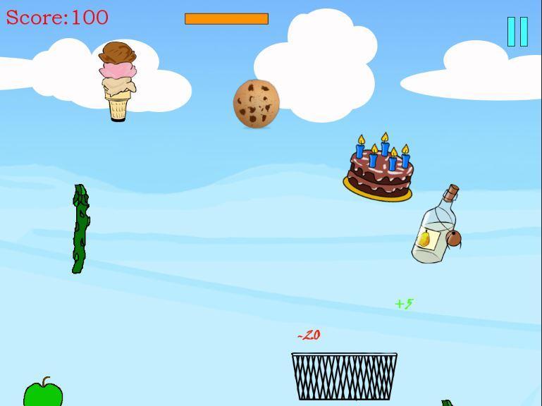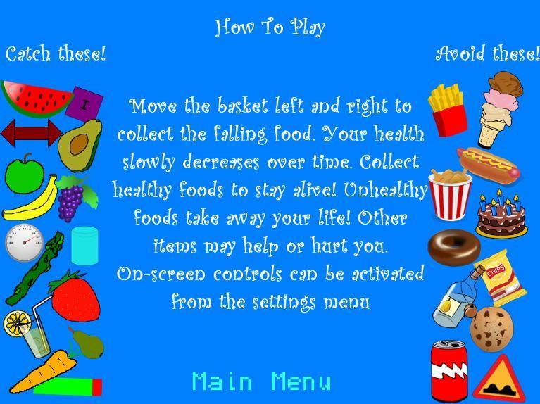 เลื่อนตะกร้าซ้ายและขวาเพื่อรวบรวมอาหารที่ตกลงมา สุขภาพของคุณลดลงอย่างช้าๆเมื่อเวลาผ่านไป รวบรวมอาหารเพื่อสุขภาพเพื่อมีชีวิตอยู่! อาหารที่ไม่ดีต่อสุขภาพทำให้ชีวิตของคุณหายไป! รายการอื่น ๆ อาจช่วยหรือทำร้ายคุณ การควบคุมบนหน้าจอสามารถเปิดใช้งานได้จากเมนูการตั้งค่า