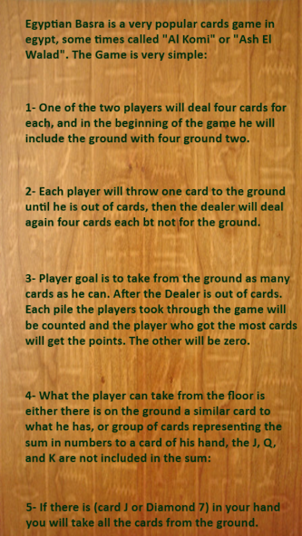 Egyptian Basra เป็นเกมไพ่ที่ได้รับความนิยมอย่างมากในอียิปต์บางครั้งเรียกว่า "Al Komi" หรือ "Ash El Walad" เกมง่ายมาก:
