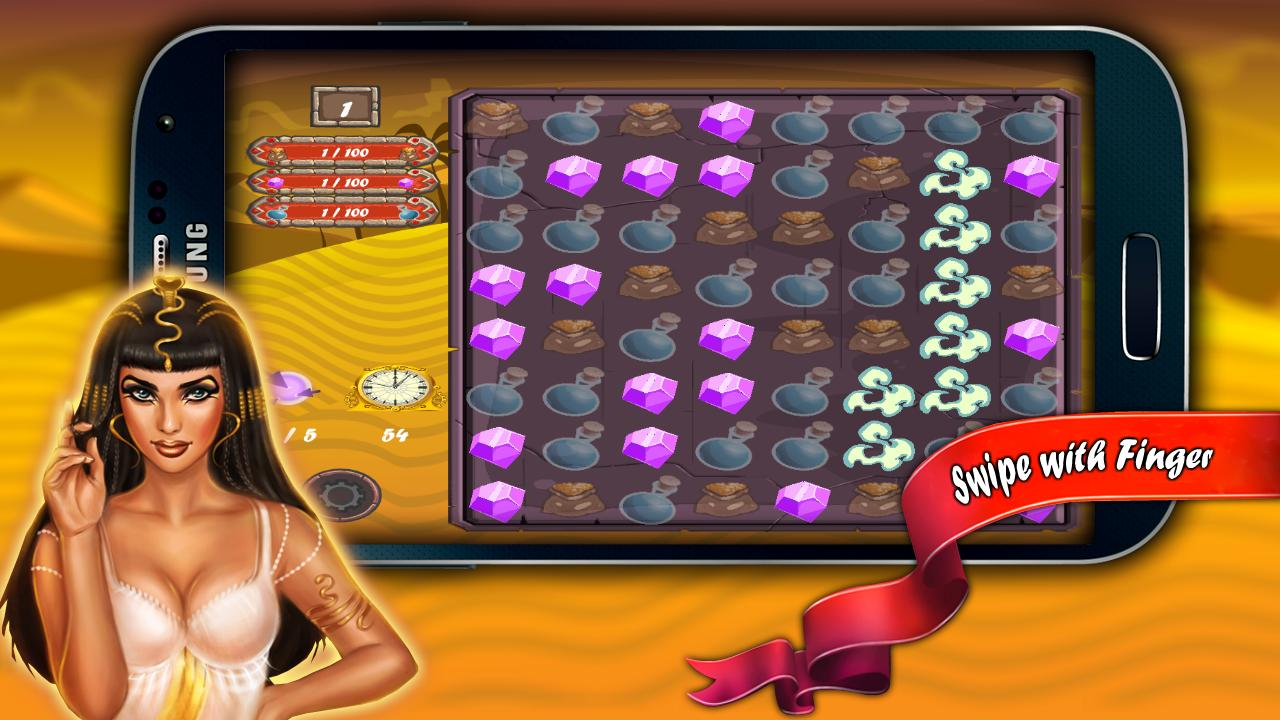 วัตถุประสงค์หลัก Booty of Cleopatra - Loot Flow คือการเล่นเป็นโจรมือใหม่ที่พยายามหาวิธีที่จะบุกเข้าไปในห้องขุมทรัพย์ของราชินีแห่งพีระมิดไนล์ในเกมสัญลักษณ์การแข่งขันครั้งนี้ ในการไปถึงระดับต่อไปคุณจะต้องต่อสู้กับนาฬิกาและเพียงแค่ติดตามการไหลของสัญลักษณ์ที่เหมาะสม อย่างไรก็ตามคุณจะต้องรวดเร็วจริงๆที่จะทำในเวลาที่กำหนด ยิ่งไปกว่านั้นการปัดอย่างไร้เหตุผลจะไม่ทำให้คุณไปไกลเกินไปในเกมเนื่องจากคุณต้องการให้โฟลว์ดำเนินต่อไปได้นานที่สุด