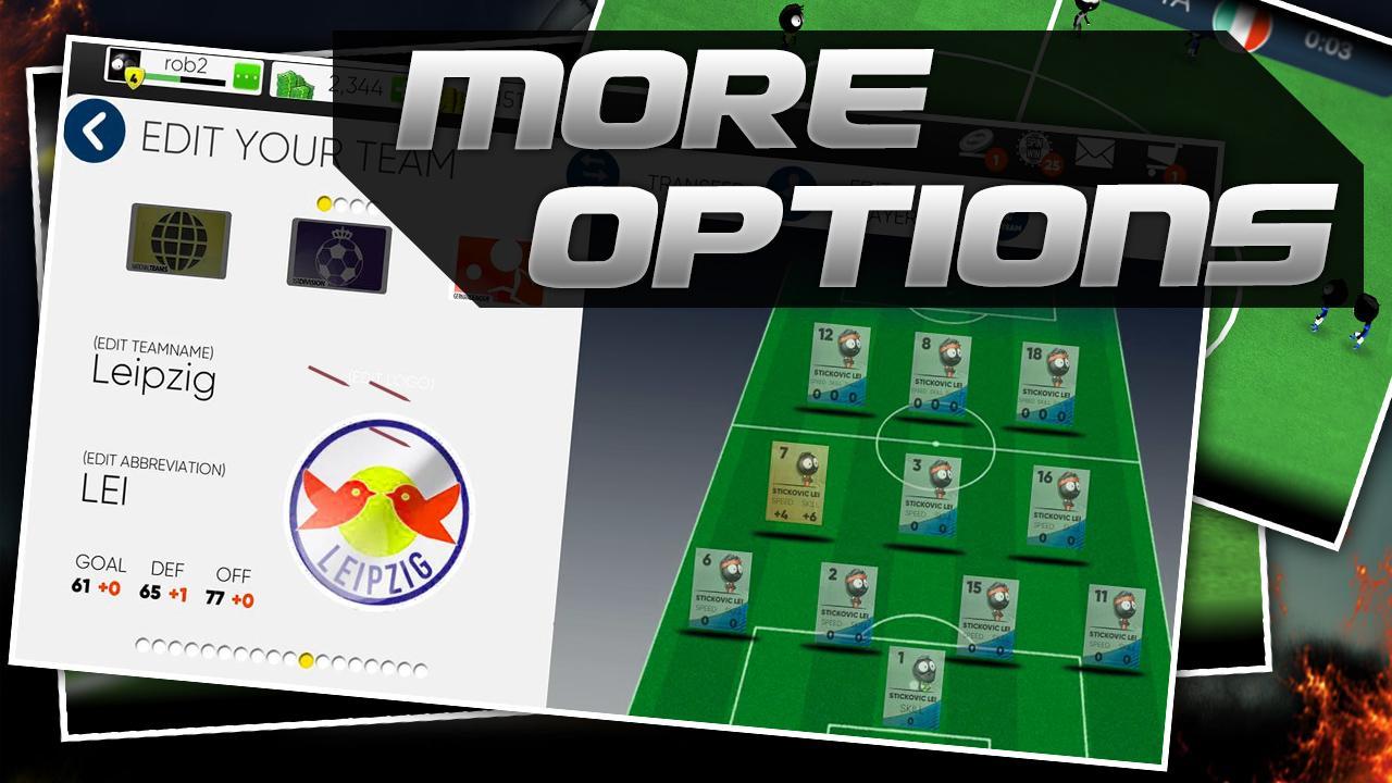 Stickman Soccer มีทีมฟุตบอลและผู้เล่นที่เกี่ยวข้องมากที่สุดในปี 2561 นอกจากนี้ตัวชี้วัดและการออกแบบของ Stickmans ก่อนหน้านี้ได้รับการแก้ไข เกมดังกล่าวมีสามโหมดของความซับซ้อนแม้นักเล่นเกมที่ไม่มีประสบการณ์มากที่สุดจะสามารถเข้าใจการจัดการได้