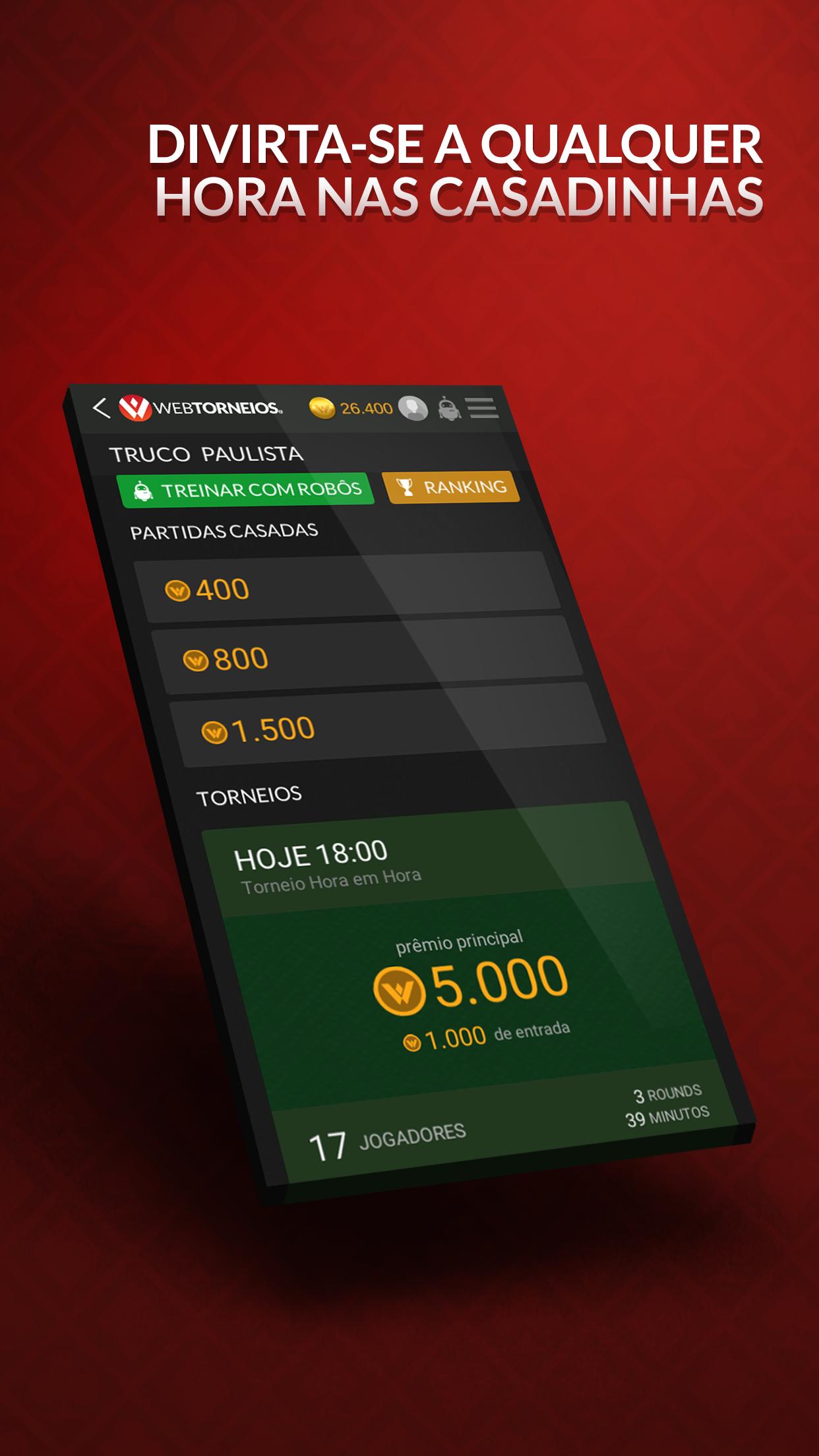 แอปพลิเคชัน Truco Mineiro ออนไลน์ฟรีพร้อมทัวร์นาเมนต์และ Casadinhas! ดาวน์โหลดตอนนี้และเริ่มเล่น webtorneios Truco Mineiro กับผู้เล่นจริง รับ 10,000 เหรียญเสมือนจริงเพื่อเริ่มสนุก เติมฟรีทั้งวัน!