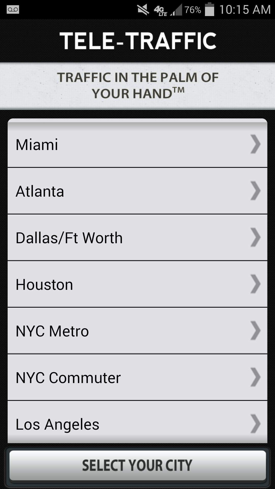 要使用Tele-raffaffic,请单击菜单中您选择的城市,单击“播放”按钮,然后在离开家之前,工作……或任何可能离开或前往的地方,在您离开家之前听到交通报告。需要听听您要去的另一个城市正在发生的事情吗?你也可以做到。