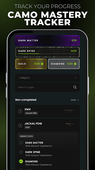 - 以最完整,最高级的功能可用来跟踪您的精通迷彩的进度。