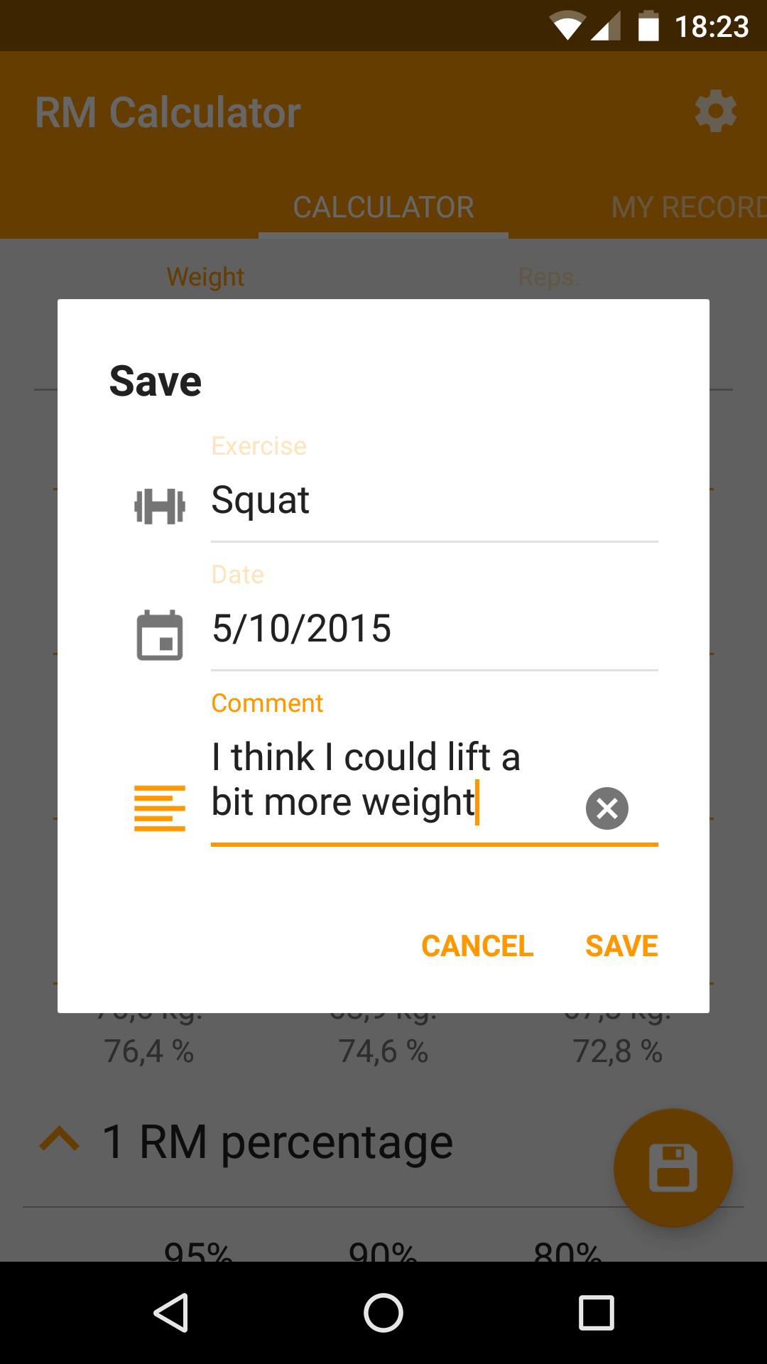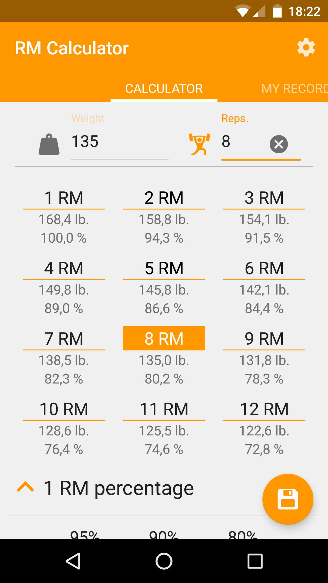 RM Calculator使用七个最佳公式来计算您的最大代表(Lombardi,Brzycki,Epley,Mayhew,O'Conner,O'Conner,Wathan,Lander),您可以选择其中一个,或者为最准确的最大次数找到最准确的结果。