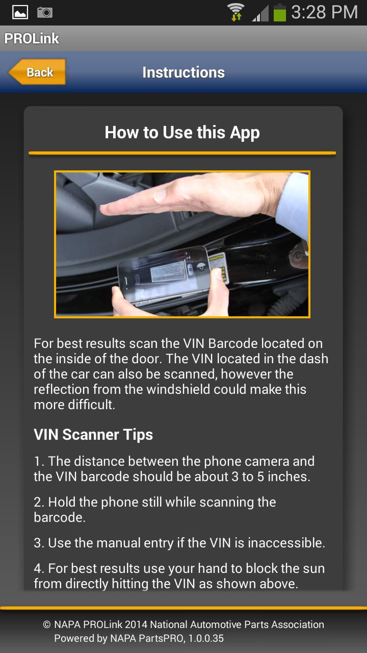 汽车专业用户可以使用新的NAPA移动VIN捕获应用程序在车辆上捕获和解码车辆信息编号(VIN)代码。一旦在移动设备上捕获并解码VIN,VIN和车辆将立即出现在NAPA PROLink目录选项中,您可以在NAPA PROLink软件中使用它来开始NAPA目录部分搜索和/或将其连接到新的或现有的客户。
