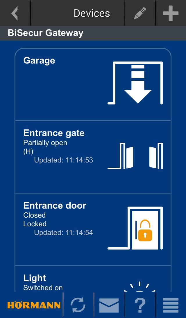 使用BiSecur应用程序,您可以始终概述车库门和入口门的状态以及入口门*。自我解释的图标向您展示您的门是打开的还是关闭的,或者您的入口门是锁定还是解锁。