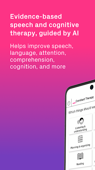 恒定治疗是一种屡获殊荣的,基于科学的认知,语言和语音疗法应用程序,旨在帮助人们从中风,创伤性脑损伤(TBI)或患有失语症,失语症,痴呆症和其他神经系统状况的人们中康复。加入一个有60万名用户的社区,他们接受了进步,通过不断的治疗完成了2.5亿+循证治疗活动。在AI的指导下,获得无限疗法,可以让您在需要的时间和地点进行治疗练习。