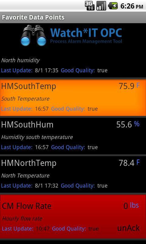 Watch*IT OPC Android TM应用程序为用户提供了一种与Watch*IT OPC Enterprise和Express Editions互动的方法,该版本可从商店地板上提供有关事件和过程值的窗口。它以新的方式将Watch*IT OPC功能扩展到您的Android智能手机。 Watch*IT OPC已经可以在遇到警报时在Twitter上发送您的电话短信,在Twitter上的推文以及电子邮件,但是现在您可以使用Android 2.2或更高的智能手机探索网站的当前状况。