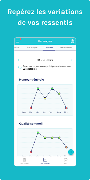 在“我的条目”中:您会发现每日问卷,您可以在其中遵循“焦虑,痛苦,士气,情绪,压力,压力,忧郁,悲伤,动机,睡眠,性欲,性欲,失眠”或行为等指标。您还可以通过从预先填充的清单中进行选择或自定义药物来输入药物摄入,例如抗抑郁药,如果不是医生通常处方的药物。