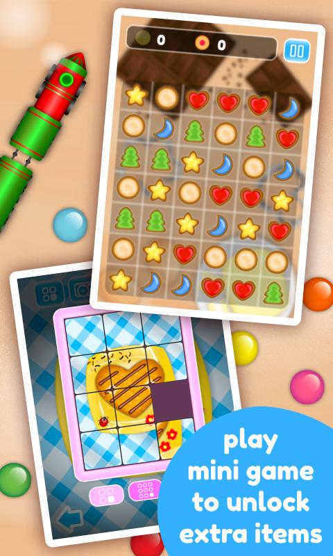 在这款出色的烹饪游戏结束时,您可以添加一些玩具并开始乐趣!吃您美味的饼干,玩您喜欢的玩具,并用滑梯拼图或Cookie Crush Minigame玩得开心。