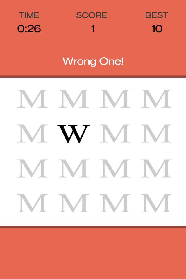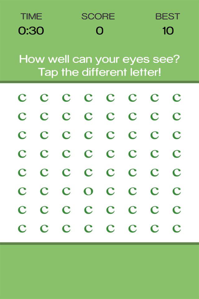 Tap the different letter in each grid to advance to the next level. Every subsequent level gets bigger and harder. Test you eye sight and spot the right letters in each level. Play through 3 amazing levels of different difficulty. How much can you score in 30 seconds? Find out now in this ultimate eye exercise!