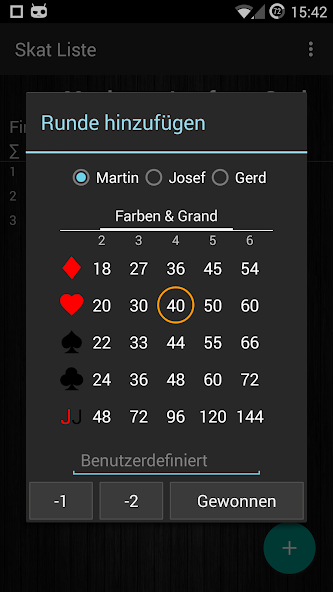 Skat Scorer可以帮助您保留SKAT匹配的得分列表。此外,每个玩家的得分总和(Fabian Seeger)将永久显示。