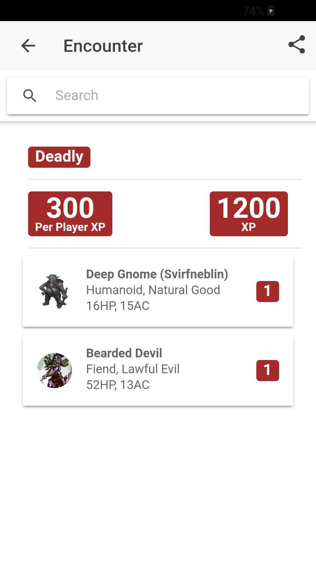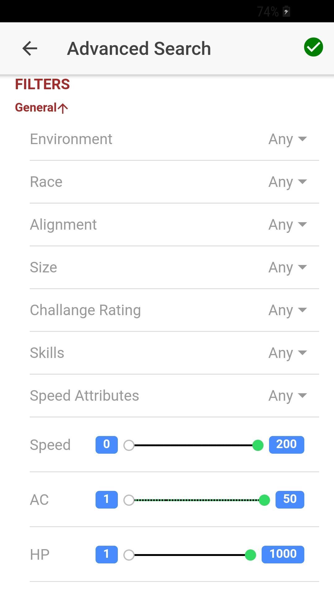 按环境,种族,对准,大小,技能,速度,主要统计数据,其动作等等,甚至具有高级搜索选项的背景,搜索怪物之间的搜索。