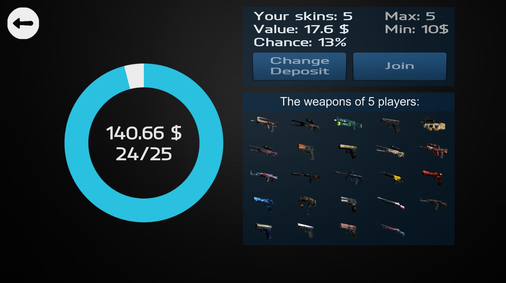On the main application of the application we have 7 buttons leading to open boxes, your inventory - here you can see your acquired items, contracts - here you can fill out the contract, which you need 10 weapons of the same class to get up to the upper class weapons, statistics, jackpot - simulation of playing in roulette where you add to the pool of weapons with a value, and depends on the value of your pool chances of winning.还有新的大奖V2,您可以在其中换武器以黄金,然后用这种黄金弹奏轮盘赌。