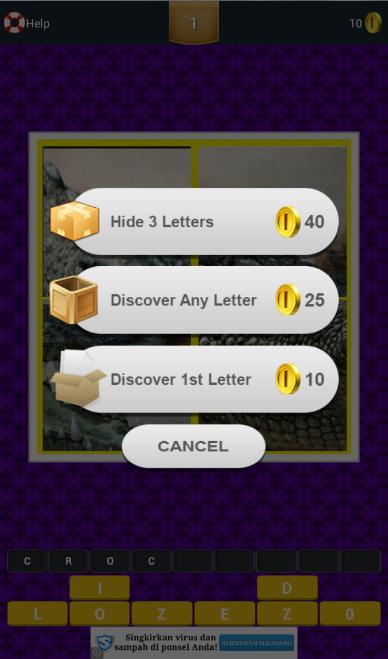 如果您是正确的猜测,将会增加硬币(+ 15),如果没有,则将减少硬币(-5)。您只能在猜测时犯三个错误(只有3个“生活”),如果更多的话,它将可以追溯到游戏的开始。如果您坚持使用游戏,则可以使用游戏中可用的三个帮助。有3个字母,发现任何字母或发现第一字母。
