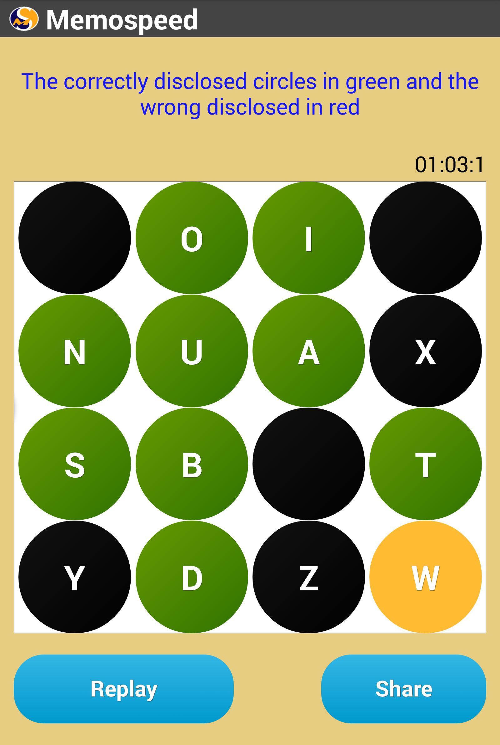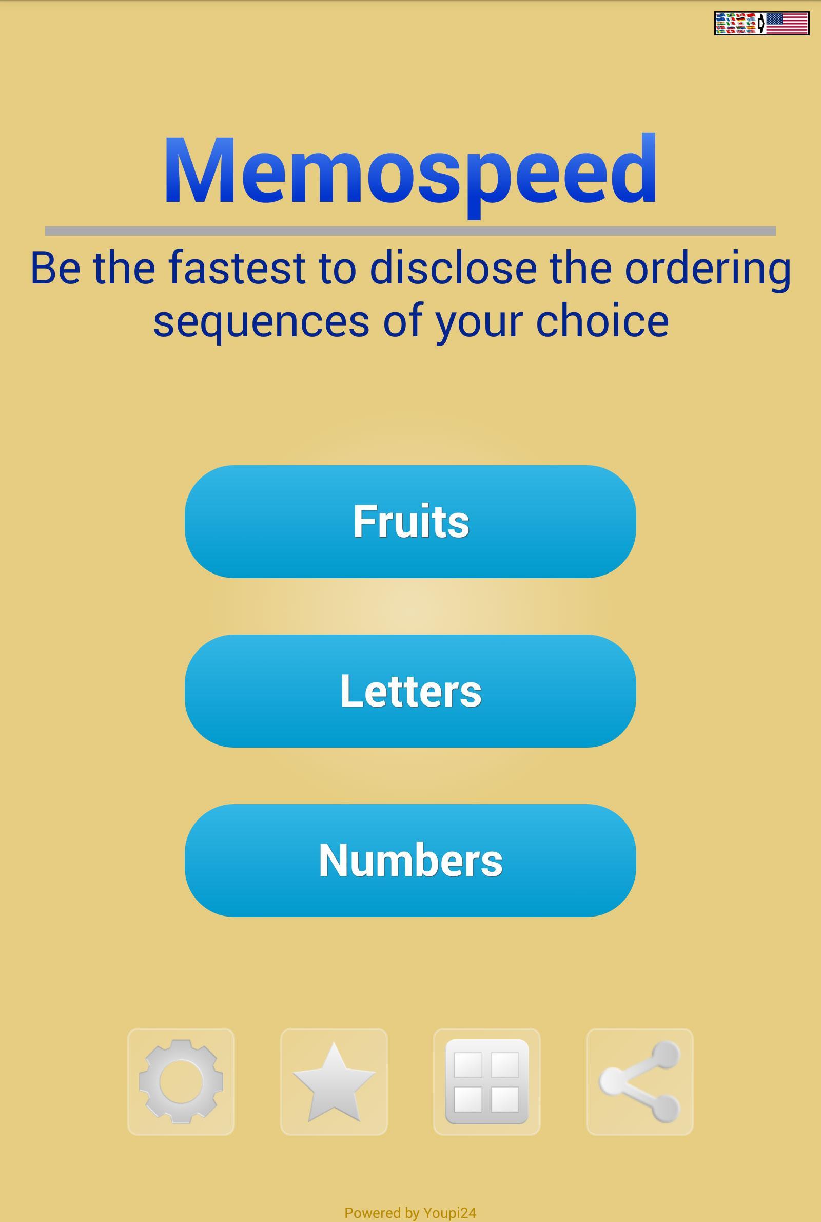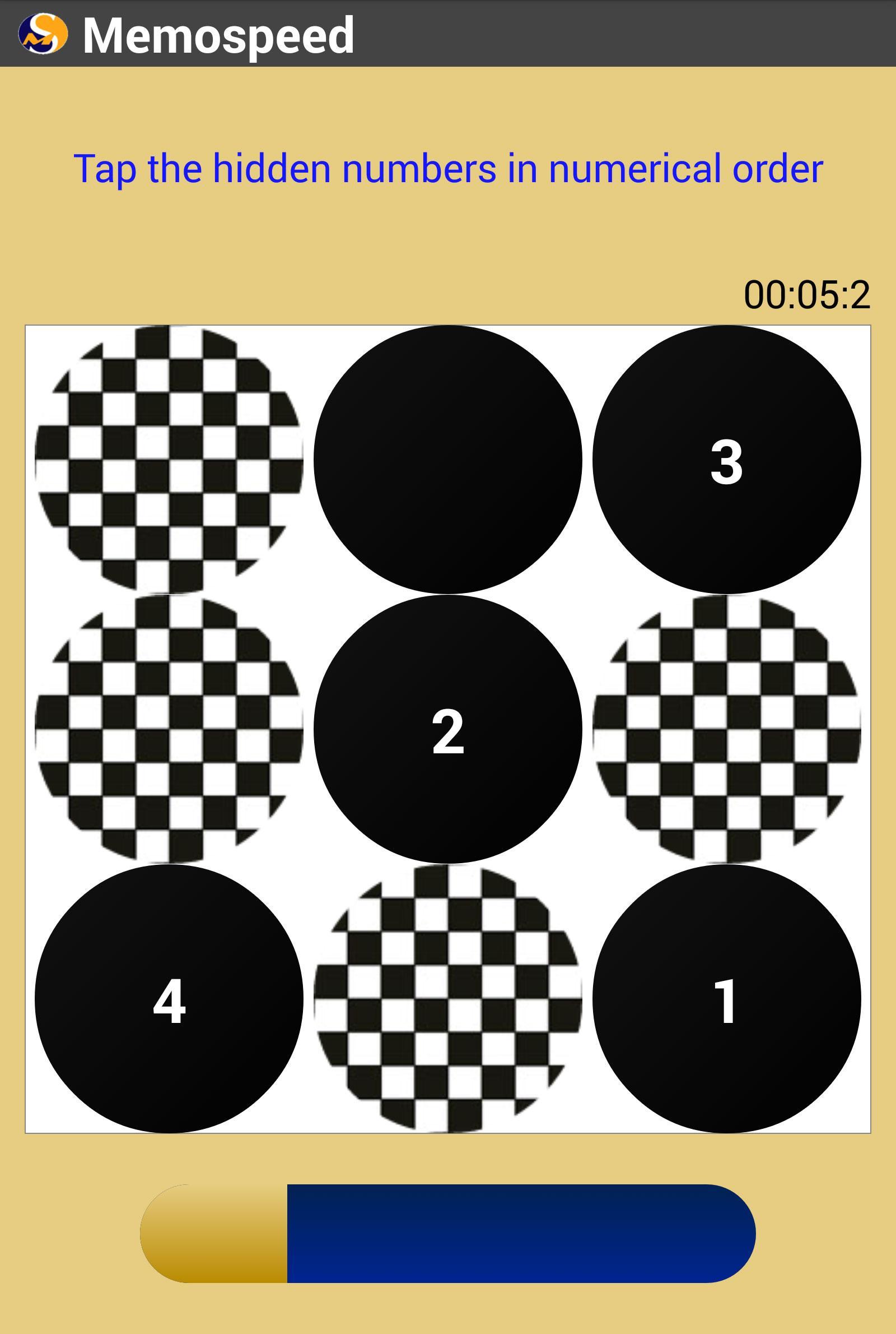 Memospeed是一个直观的内存游戏,只有一个规则和48个级别的难度。播放Memospeed很简单,可以选择要记住的数字,字母或水果,在彩色圆圈上观看它们,然后尽快披露它们。
