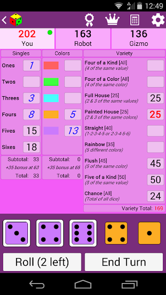 目标是通过滚动骰子得分以进行某些组合。在每回合期间,您最多可以将骰子滚动3次,并可以在重新滚动之前选择要握住的骰子。在3卷后(如果决定停止)之后,您必须在记分卡上选择一个类别才能分配点。每个类别只能使用一次。玩家轮流执行此操作,直到使用所有得分类别,然后谁获得最高得分。应用程序中包含更多详细的说明。