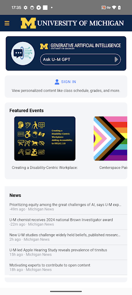 密歇根州的應用程序提供了與學術生活,個性化的課堂時間表信息,基於地點(校園建築物)的搜索有關的應用程序內消息和提醒,以及人員(教職員工,教職員工和學生),基於位置的內容,包括公共汽車站,停車位和餐廳,以及特色大學活動。