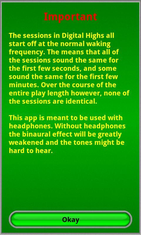 Digital Highs僅包含帶有粉紅色噪音背軌道的雙耳程序。與基於MP3的播放器相比,這節省了您的Android設備上的數百個兆字節空間。與i-doser相比。