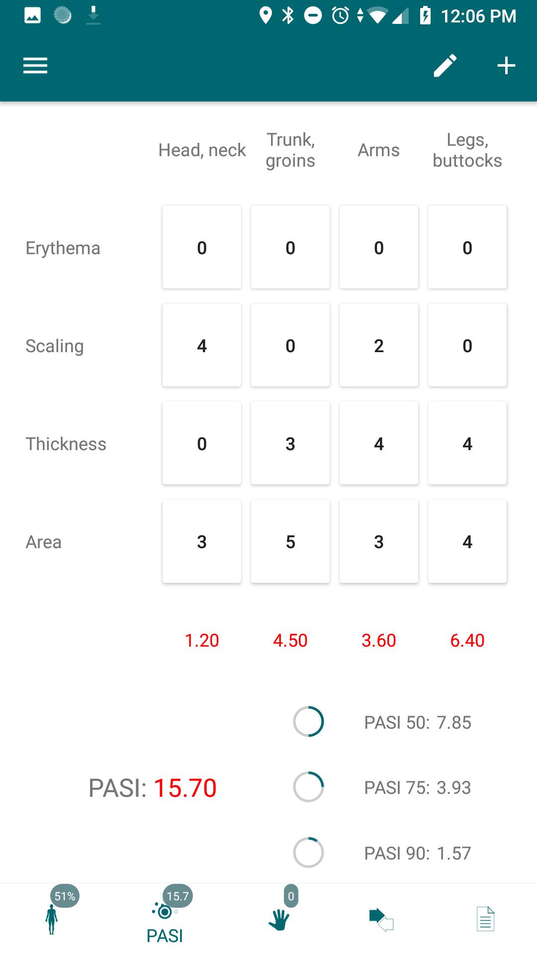 * PASI:這是對1978年開發的牛皮癬嚴重程度的經典評估。其值範圍為0到72。嚴重性計算是單獨執行的:包括頸部,後備箱,上肢和下肢在內的頭部,包括臀部。它包括對PASI 50,PASI 75和PASI 90的自動計算,可用於定義治療終點和功效。