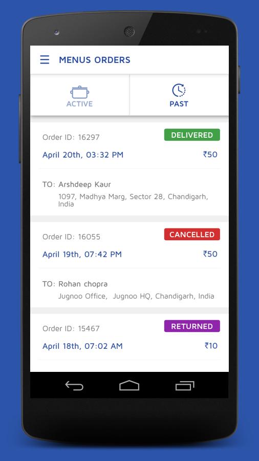 * Jugnoo Menus-我們的餐廳食品交付領域。這使消費者可以從菜單上的餐廳訂購食物。目前在諾伊達(Noida),古魯拉姆(Gurugram),印多爾(Indore),昌迪加爾(Chandigarh)和齋浦爾(Jaipur)運營。業務應用程序允許菜單商人 -