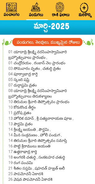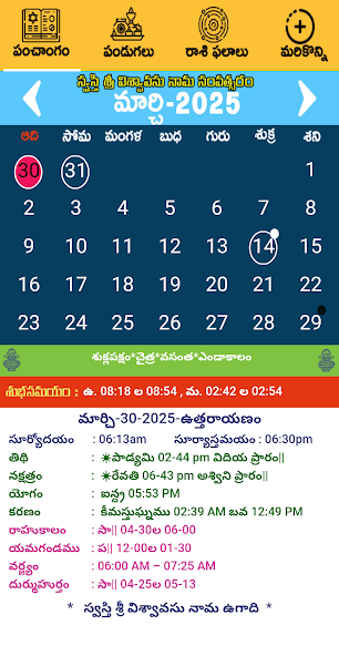 Telugu Calendar Panchang 2025允許您查看Maasam Kalam Rutuvu Vaaram Thitdhi和Nakshatram Yogam karanam sooryodhayam sooryaasthamam信息。