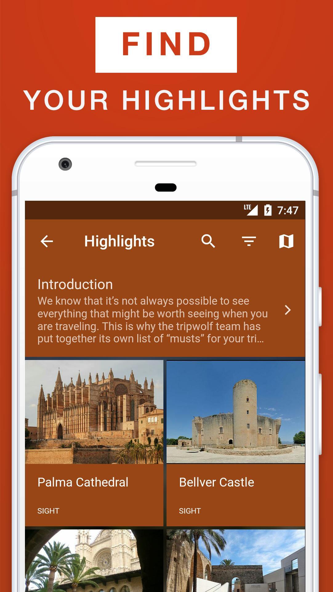Palma de Mallorca旅行指南應用程序是免費的,並包含可選的應用內購買。免費內容包括所有重要地方的概述,以及Wikipedia,Yelp,Foursquare,Quandoo和Booking.com的內容。可以在線提供諸如Day計劃者,路由和地圖之類的功能。