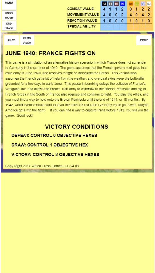 該遊戲是對1940年夏天法國不投降給德國的另一種歷史場景的模擬。該遊戲假設法國政府於1940年6月上旬流放,並決心與英國人一起戰鬥。該版本還假設法國人會從天氣中獲得一些幫助,而陰天的天空在6月初將Luftwaffe紮根了幾天。轟炸中的這種停頓延遲了法國的韋根線的崩潰,並允許法國第十軍撤軍到布雷頓半島並挖進去。法國南部的法國軍隊也重新集團並繼續戰鬥。您扮演盟友,您必須找到一種方法,直到1941年底或18個月結束。到1942年,世界活動應該開始偏愛盟國(俄羅斯和德國可能會發動戰爭。也許美國參加了戰鬥)。如果您可以找到一種在1942年之前捕獲巴黎的方法,那麼您將贏得比賽。