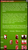 玩家通過玩同月的卡(花)來捕獲中央佈局的卡片。目的是在捕獲的卡片中收集得分組合。當玩家的捕獲具有足夠的價值時,玩家可以停止遊戲並要求付款,或者可以繼續比賽(GO),以期獲勝,但冒著同時贏得對手會贏得的風險。正是這一決定停止或走了,才能為遊戲的名字命名。