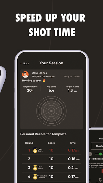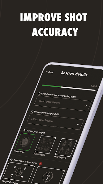 培訓部分是該應用程序的初始區域,用戶可以練習其射擊技巧。開始會話後,顯示警告屏幕以確保在開始會議之前進行適當的槍支安全性。用戶同意後,目標將出現在屏幕上。用戶通過使用兩個手指覆蓋目標的圓周來校準屏幕到目標。然後,選擇了距目標的距離,並且可以開始射擊。槍支的每槍都會觸發激光,該激光器在目標上發出激光罷工,並且應用程序記錄了分數。屏幕上出現射擊指標,以向用戶展示會話期間的情況。這伴隨著音頻。會話完成後,所有鏡頭將顯示在目標上並保存到檔案中。