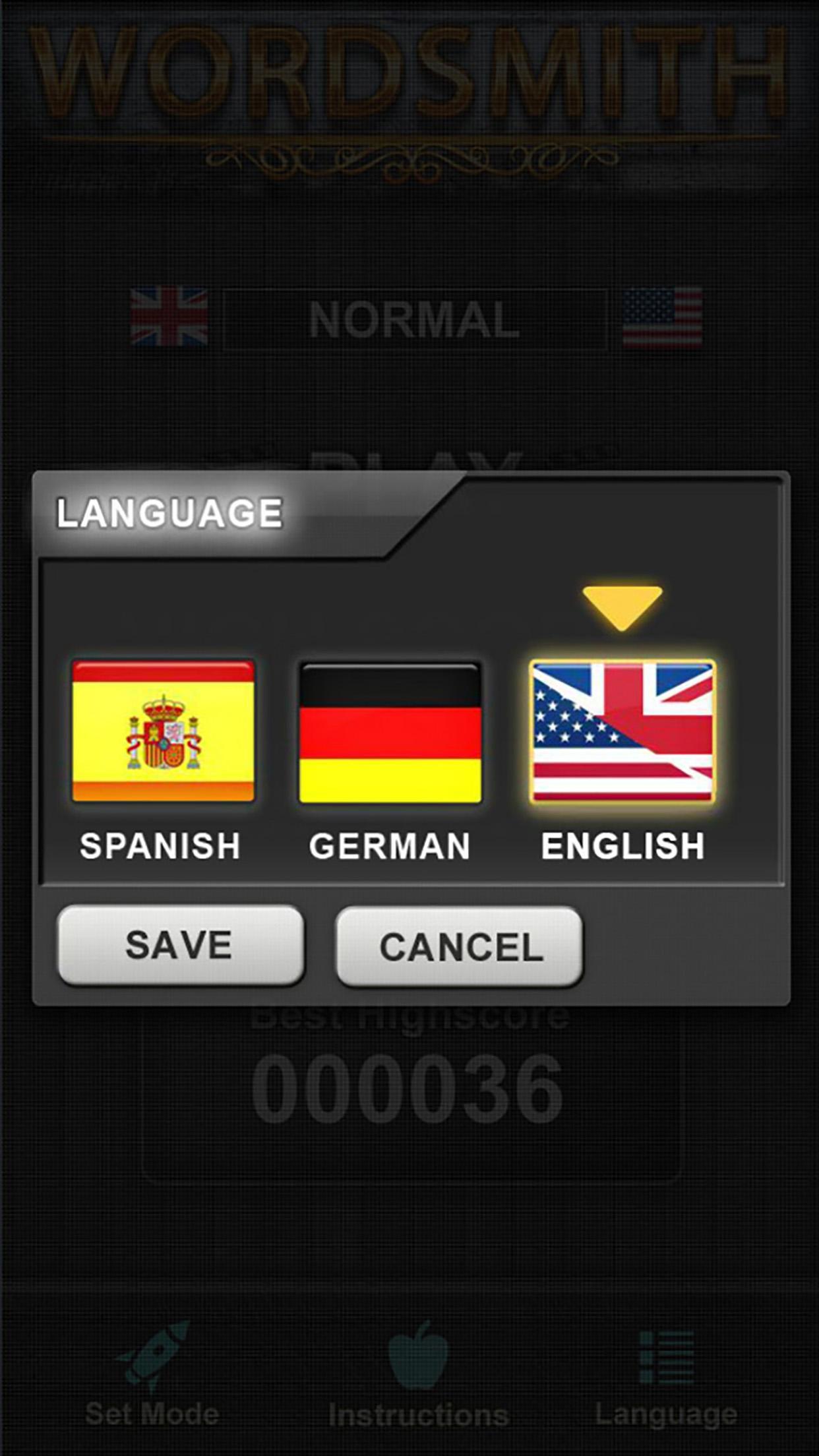 -3個字典中包含數千個單詞:英語,德語和西班牙語。您可以通過遊戲的“語言”對話框切換字典。