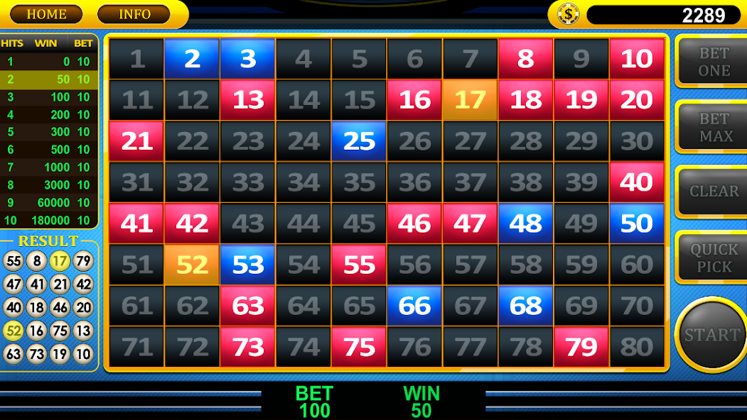 給玩家提供一張票,上面有80個數字。他在票上選擇1到15個數字。隨機選擇20個獲勝數字。選擇的選秀權越多,支出就越大。